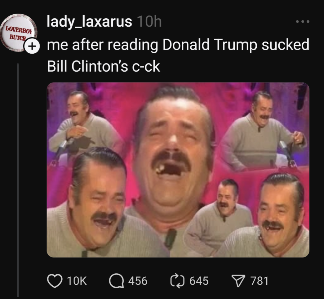 The reaction to the Trump/Clinton blowjob rumor was easily the funniest thing that has happened in like, a decade. For several hours, I couldn’t turn anywhere, on any social media platform without seeing thousands upon thousands of memes about it. It got to the point for a while where I literally couldn’t see anything except memes about that, on any social media platform that I use. Just…endless memes about trump sucking Clinton cock. It was absolutely incredible. I don’t even think that it actually ever happened. But the fact that like two billion people latched on to it and immediately began relentlessly making fun of it is a beautiful thing. It was the most unhinged shit I’ve ever seen in my entire life, and I’m old. It was beautiful.