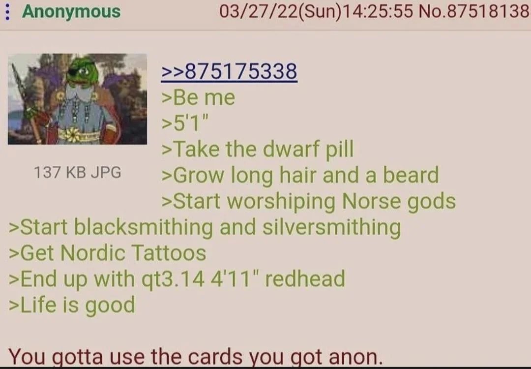 arrow-up1443arrow-down1imageAnon is 5'1"sh.itjust.works🍹Early to RISA 🧉@sh.itjust.worksM to Greentext@sh.itjust.works · 3 months agomessage-square52linkfedilink