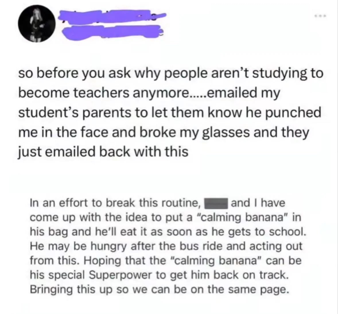 Do you think that if you were teaching a class and one of the students punched you in the face so hard that they broke your expensive prescription eyewear, that you would actually just dust yourself off and go, “oh dear, you poor thing - are you acting out due to low blood sugar? I can go get you a banana”.
