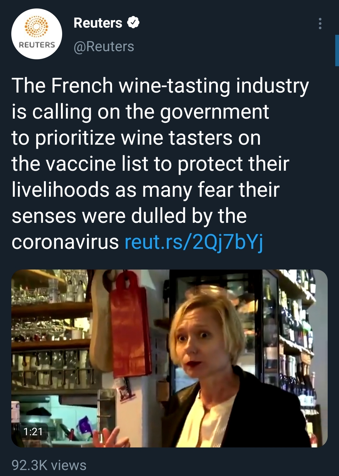 Wine tasters in the first world getting vaccinated before doctors in the third. Probably says something about inequality or something.