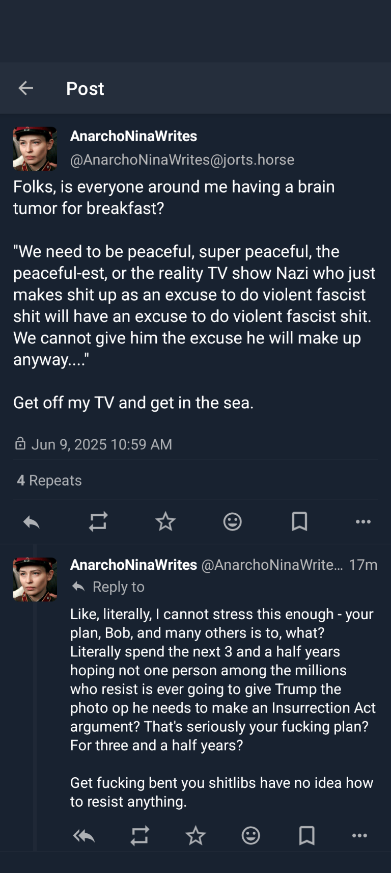 I was so, so very close to directly calling jordanlund a shitlib after it was almost certainly him who mod deleted my comment, in my own thread, in .world, stating that, speaking from a historical standpoint, the only thing that stops fascists is bullets in their brains.