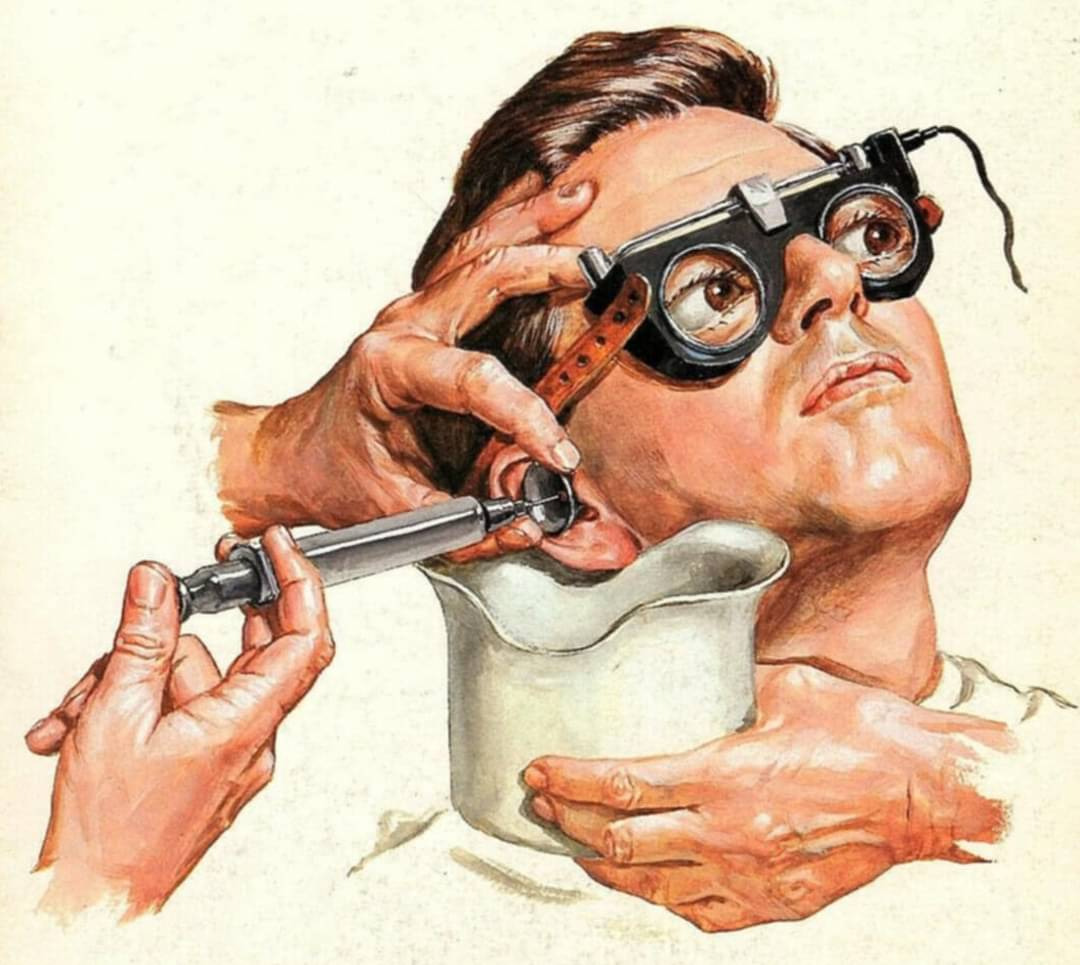 It may be caloric reflex testing. That would explain the goggles. https://en.m.wikipedia.org/wiki/Caloric_reflex_test