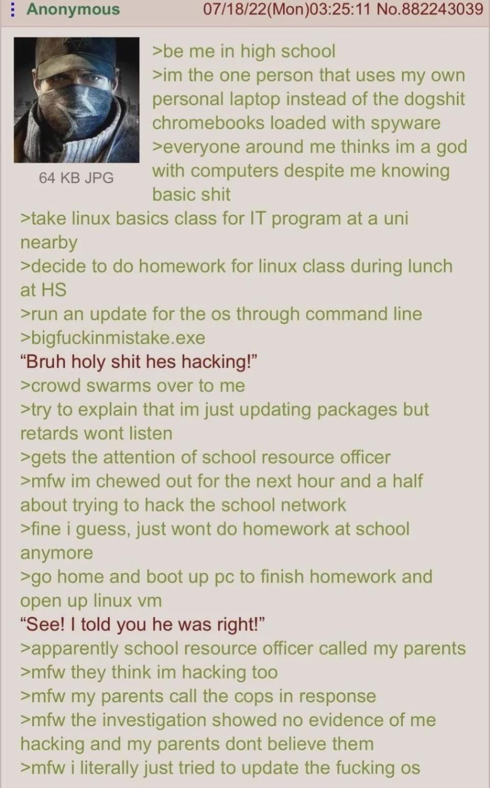 I’m sorry to inform you that when I was in high school I had classmates ask me if I was hacking when opening up the command line. We don’t have snitches though and the people here have the ability to listen to explanations.