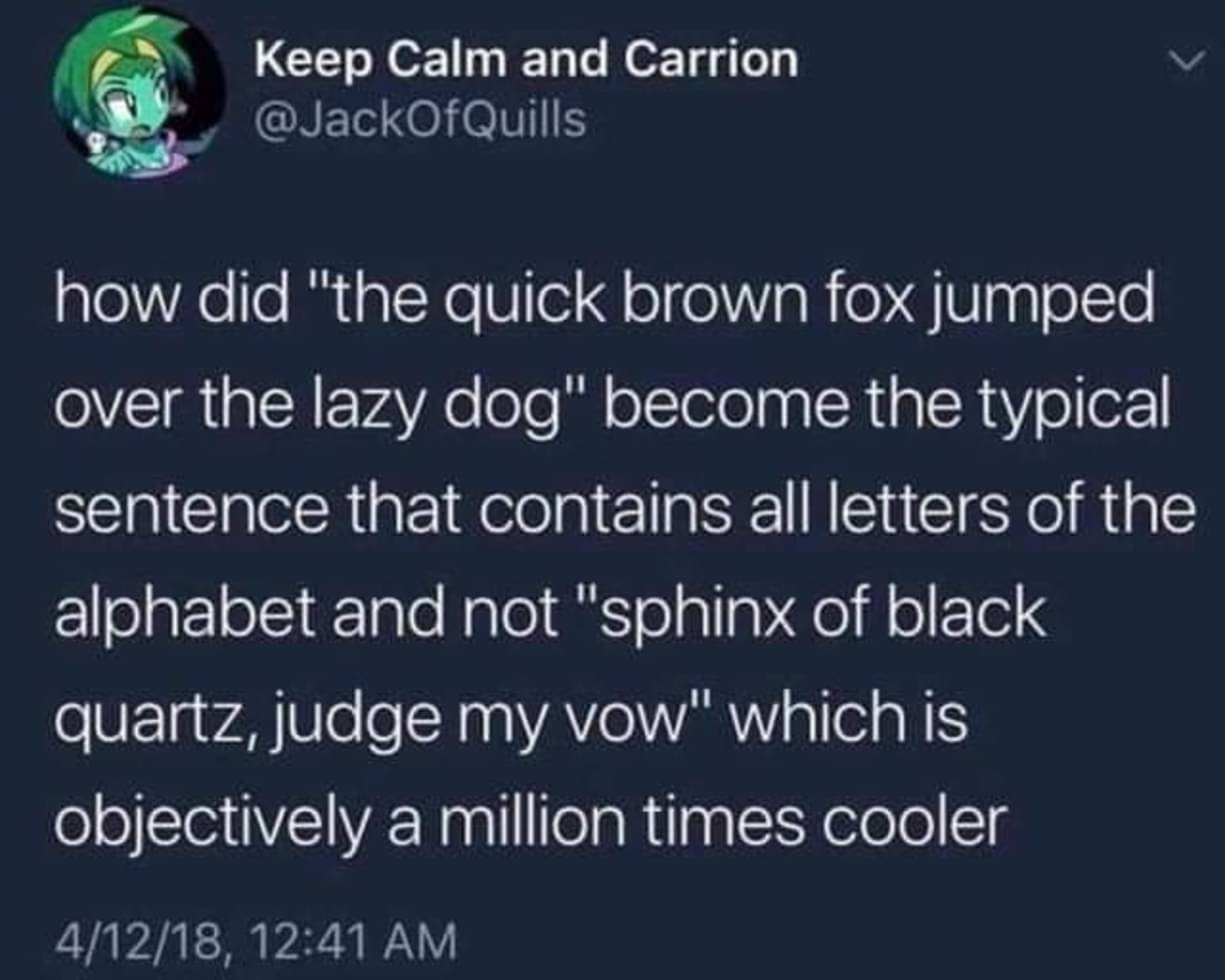 This post genuinely inspired me a year ago and now I use that sentence instead of the lazy dog one