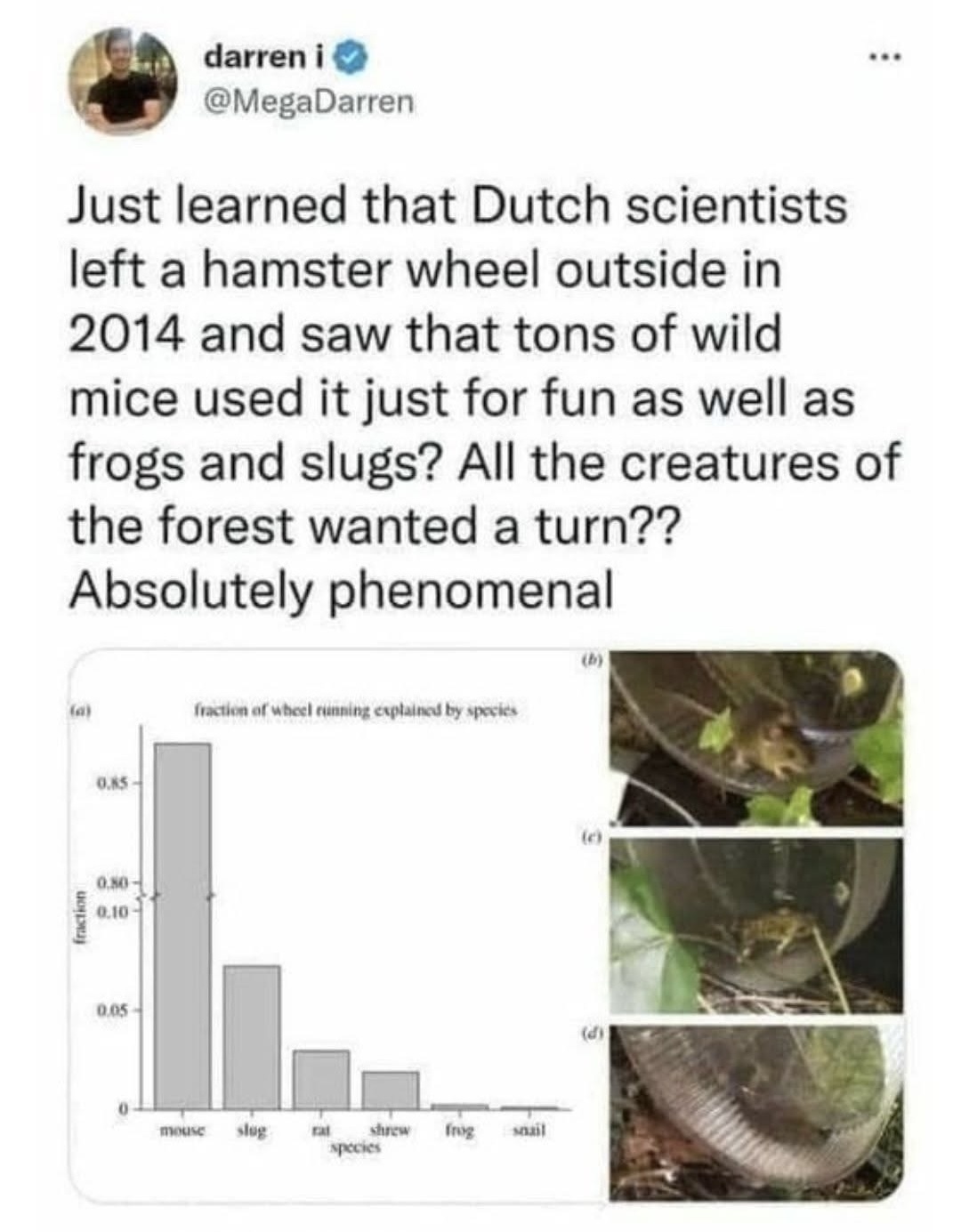 I’m imagining a Bjenny Montero cartoon, where the cartoon frog character is running on the wheel and the cartoon slug character standing next to it says “Hey! Quit hogging the wheel! I want a go.”