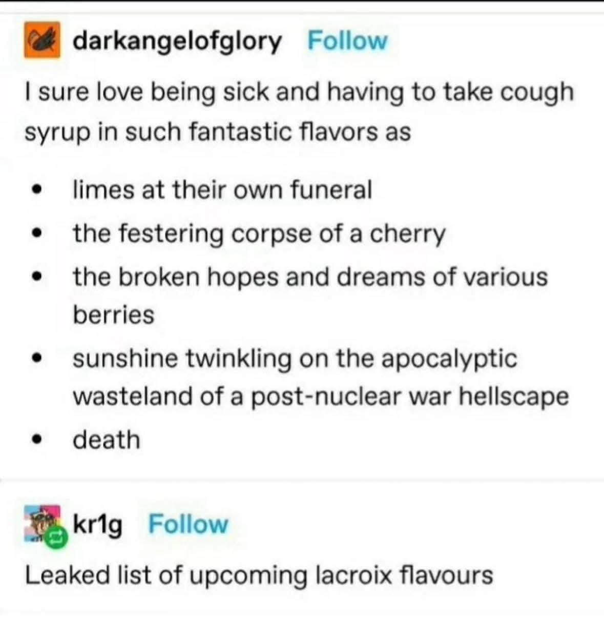 I think I disagree with “grape” being the worst though. Artificial grape flavor is the most honest one, be it medicine or soda. It’s the distant cousin that shows up to the wedding or funeral in a t-shirt, shorts, and flip flops; it’s the octagenerian emeritus faculty member that shows up to seminar and sits in the front row and sleeps through the presentation; it’s the Kazaa (or Morpheus or Limewire) file labeled “Blink182.mp3.exe”—you look at it and you know exactly what you’re gonna get.
