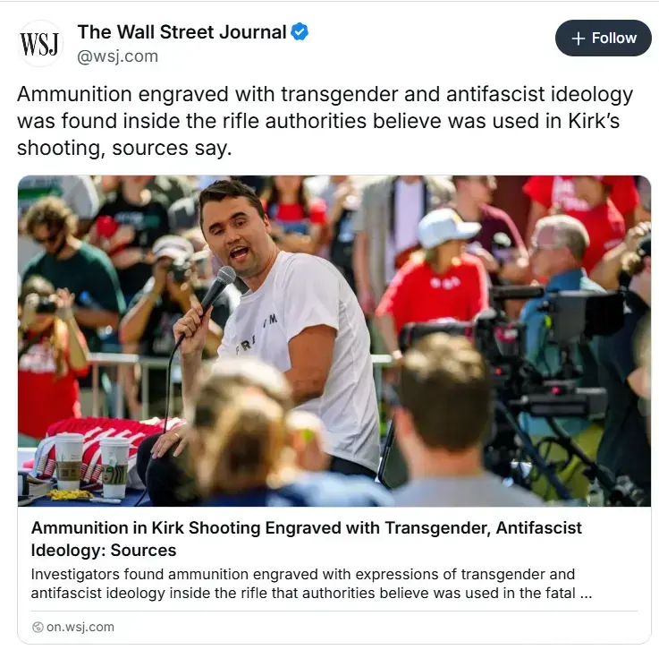 On September 11, 2025, The Wall Street Journal issued a caution regarding its earlier report on an internal law-enforcement bulletin concerning the fatal shooting of Charlie Kirk. The bulletin had mentioned ammunition found near the scene with “transgender and anti-fascist ideology” engravings, but the Justice Department indicated the report might not accurately reflect the messages on the ammunition as the probe was in its early stages.