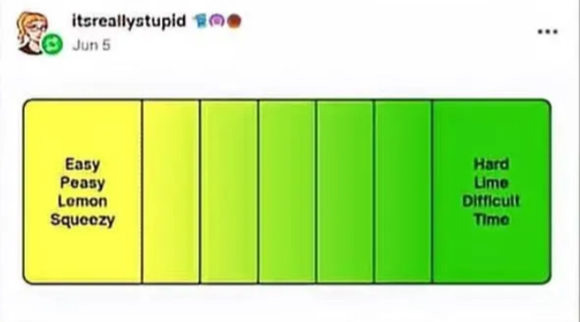 arrow-up1462arrow-down1imageThe citrus scale of difficultylemmy.dbzer0.comHootinNHollerin@lemmy.dbzer0.com to Microblog Memes@lemmy.worldEnglish · 5 months agomessage-square15linkfedilink