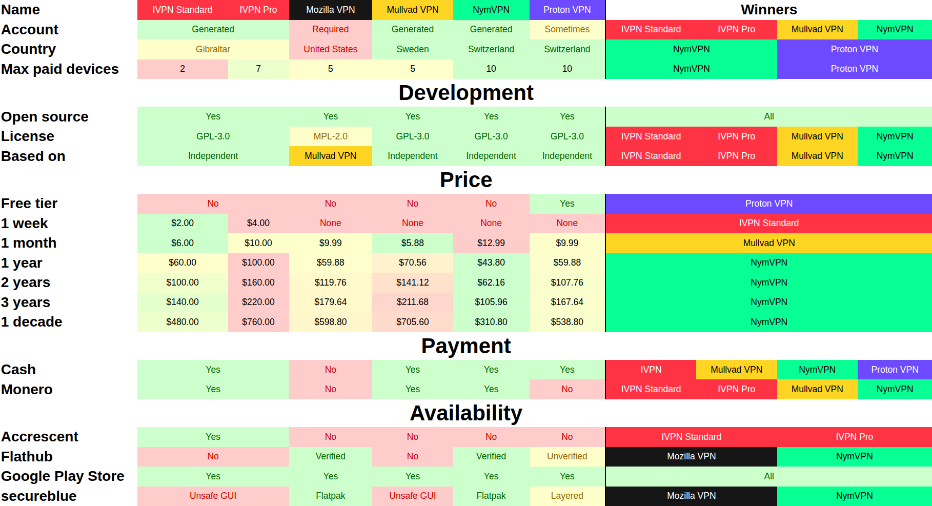 ujust install-vpncommand. Security features must be disabled on secureblue in order to use the GUI for IVPN and Mullvad VPN, but not for Proton VPN. Mozilla VPN and NymVPN are available as Flatpaks, which are safer than layering packages. - I wanted to include more categories, such as which programming languages they are written in, connection speed, and security, but that became far too difficult and complex, so I decided to omit those categories.