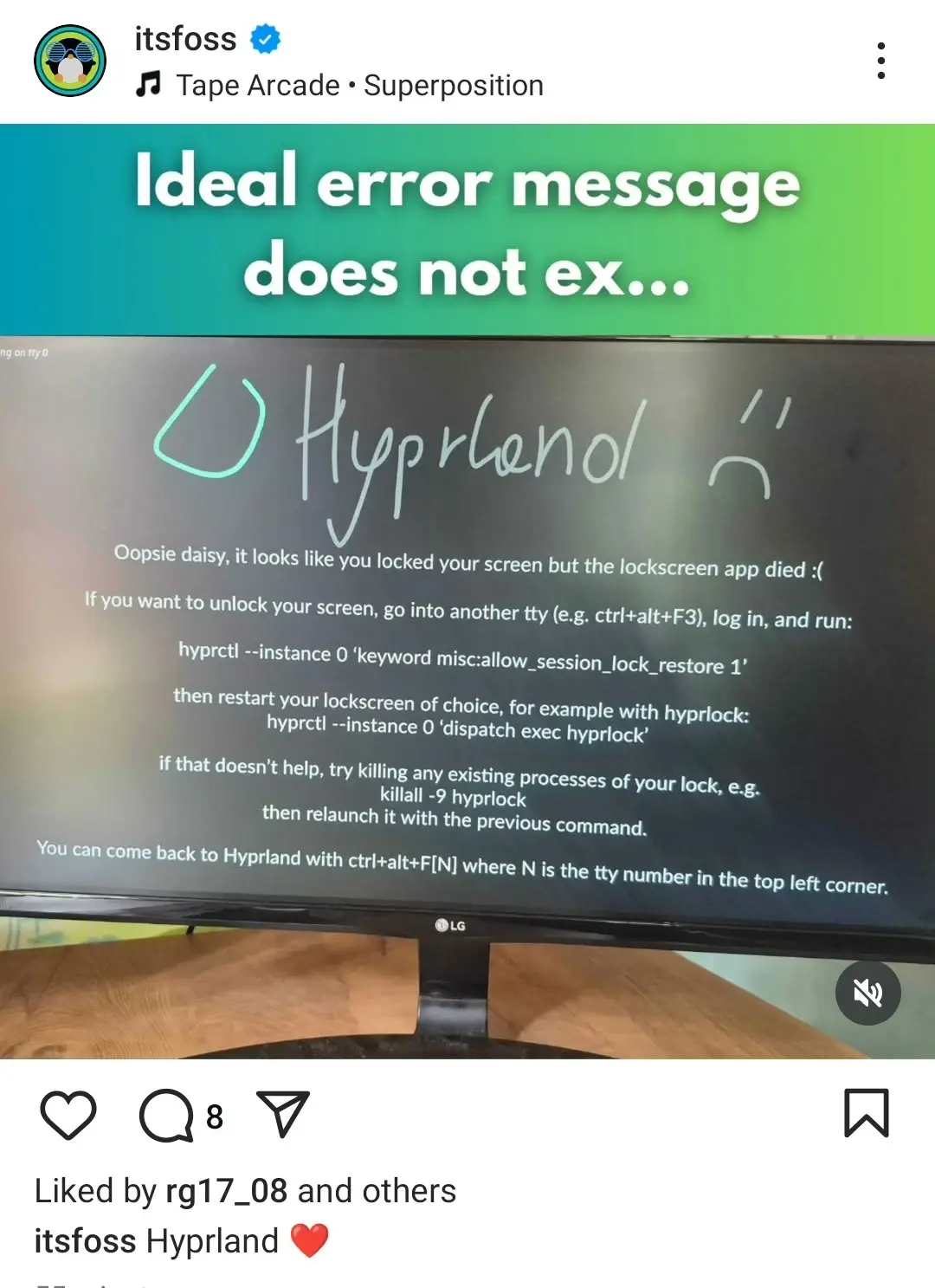 IO 😇@lemmy.blahaj.zone to Technology@beehaw.orgEnglish · 1 month agoitsfoss promotes hyprland on instagram!?lemmy.blahaj.zoneimagemessage-square41linkfedilinkarrow-up1133arrow-down17file-text