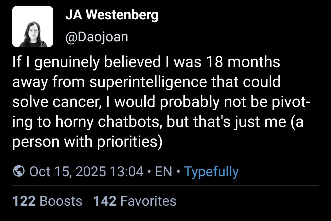 arrow-up11.28Karrow-down1imagespeak for yourselfslrpnk.netblibla@slrpnk.net to Microblog Memes@lemmy.worldEnglish · 7 days agomessage-square142linkfedilinkfile-text