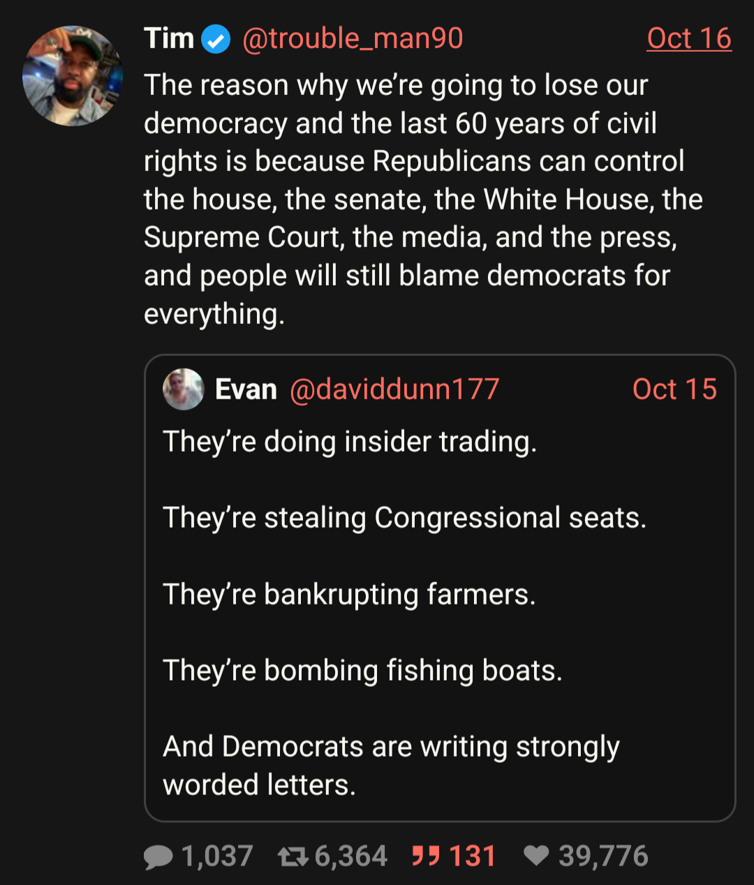 But MSNBC will still act shocked, and Democrats will still write strongly written letters. It is performative acts all the way down (note I am not saying all the way through, but those in power at all levels i.e. of both media and actual governance).