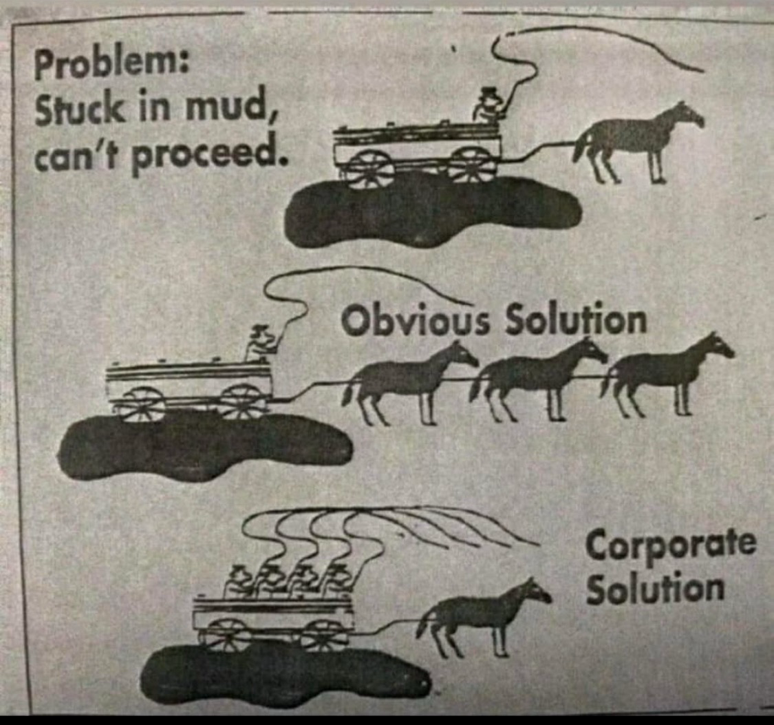 yeah this meme has always bothered me cause who tf thinks the obvious solution to such a temporary problem is go buy two more horses?? It would probably be faster to unload the cart and carry the items by hand