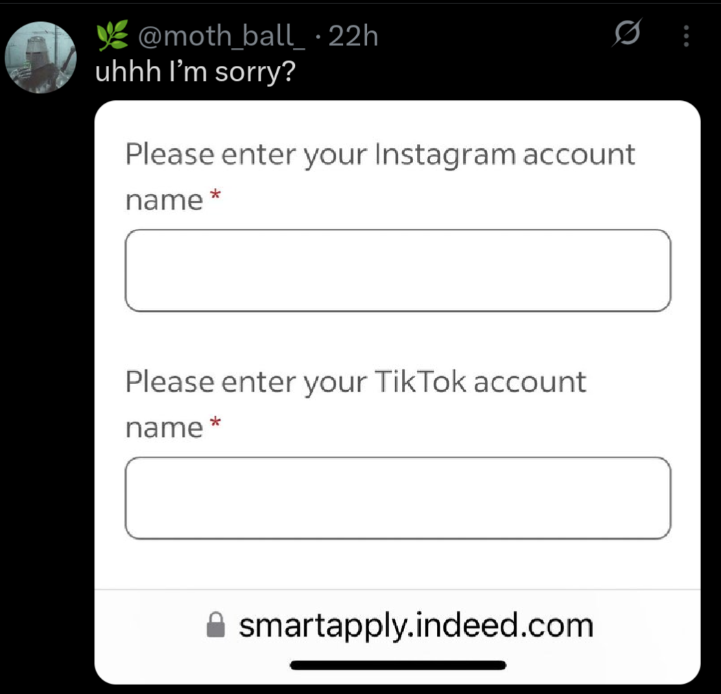 Apart from taking our data when we apply, they also ask for personal social media? Who they think they are ? We need some privacy!
