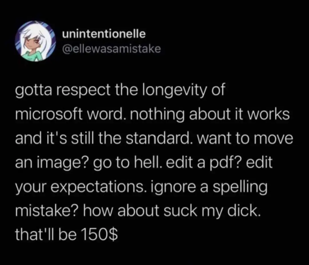 the reason you can’t just edit it is that pdf is basically a container for program code that runs on printers. so you can have text interspersed with formatting information, or text with non-existent characters approximated by vector images, or text that’s been rendered to a raster image and is not actually in the document. then you have the fact that pdf can embed specialized fonts, compressed files, security measures, and even internal programs. and it’s all offset-based in there so you need to modify the entire file structure in order to get it working again after adding text. what’s worse, since any file with a pdf document in it is a valid pdf document according to the spec, less reputable “pdf editors” can just embed whatever shit they want. it’s a common malware vector.