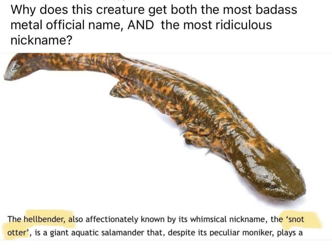 Other vernacular names include snot otter, lasagna lizard, devil dog, mud-devil, mud dog, water dog, grampus, Allegheny alligator, and leverian water newt.