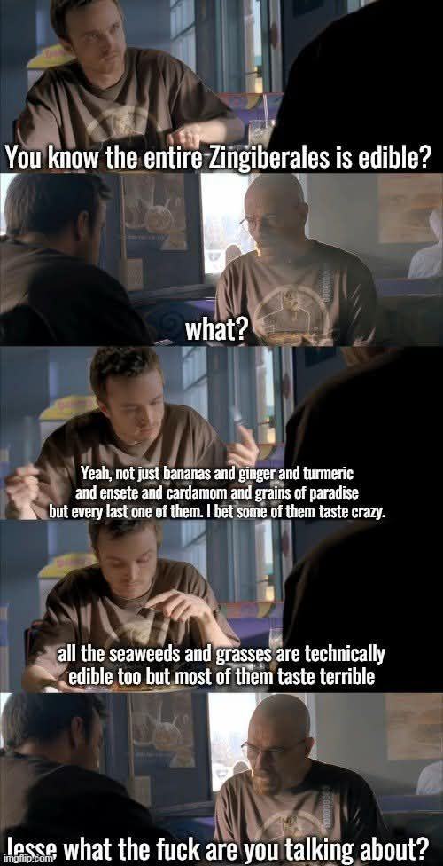 In the second half of my comment I talk about Poales. So, Poales as you might have guessed from the ending is a separate order of plants. In it are most prominently the grasses (Poaceae) OP spoke about in their post. OP talked about seaweeds, but I pointed out that they aren’t even seed plants (=Spermatophyta). I also mentioned seagrasses, which are seed plants (they even flower and are not too distantly related to the Zingiberales or Poales). But they are in another order: the Alismatales. This order’s most famous members is the aroid family Araceae (containing e.g. Monstera, Philodendron, etc).