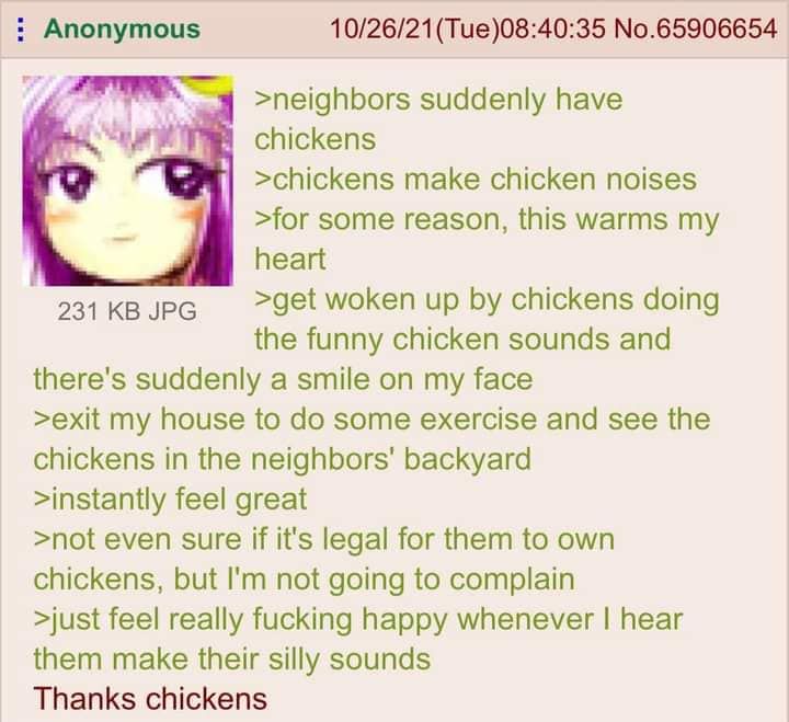 My old principal used to keep chickens, it’s from her we bought ours. Met her again many years later, and while catching up I inquired if she was still keeping chickens. Since the big bird flu thing in the 201Xs (I think) she stopped keeping them, because the law changed how you’re allowed to keep them, and she felt like while it’s obviously good from an epidemiological point of view, it’d reduce their overall quality of life and that just made her really depressed.