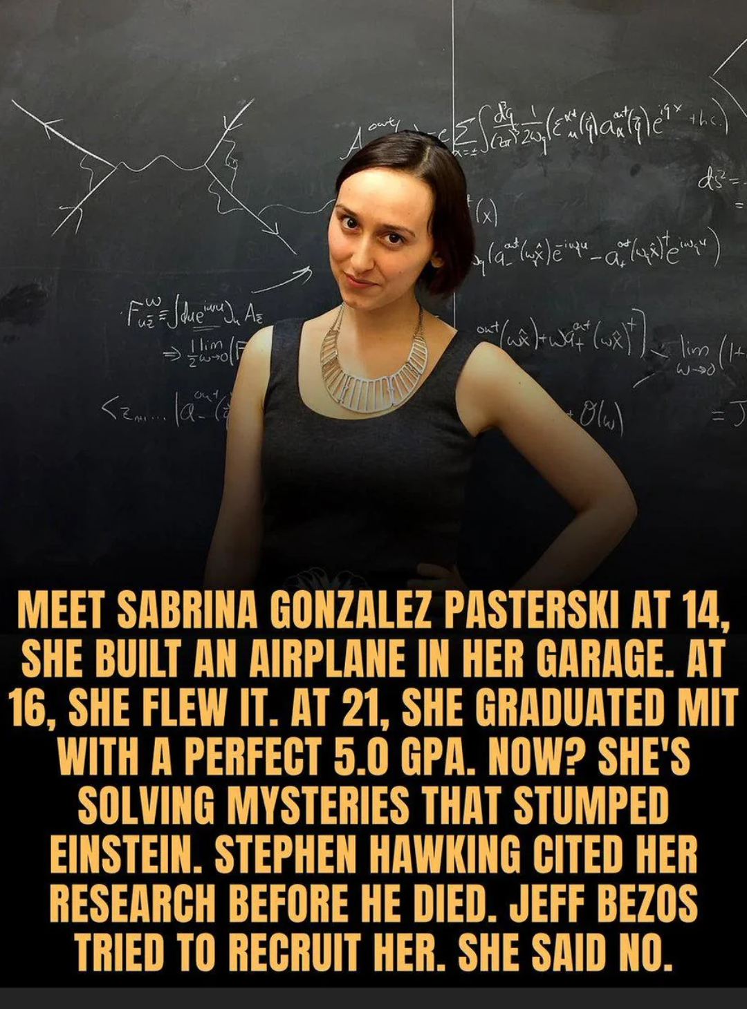 PS Sabrina didn’t actually say “no” to Jeff “the unethical” Bezos, because she wanted to work for Blue Origin and held an internship there. Choosing theoretical physics instead doesn’t mean she flipped him off—however nice that would’ve been indeed.