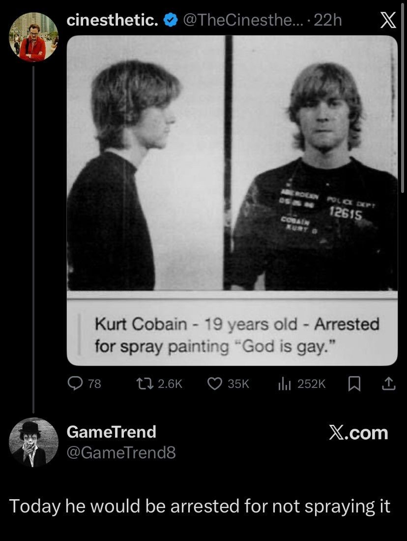 Kurt turned 19 in 1986, saying someone was gay was definitely a reference to sexuality just as much as it is now. And sadly, it’s still a slur in certain circles. Given the way Kurt always talked about gay rights (once explicitly said that racists, homophobes, and misogynist shouldn’t show up to his shoes), it’s at least fairly likely this is meant to be some dumbass faux-deep “gay means happy AND homosexual” 19-year-old shit imo. I mean that’s also prime growing-up-and-becoming-a-non-asshole years so it’s also perfectly likely it’s just straight up shitty! But also Kurt was punk adjacent and dumbass subversive comments are extremely punk. Hard to tell without talking to the guy.