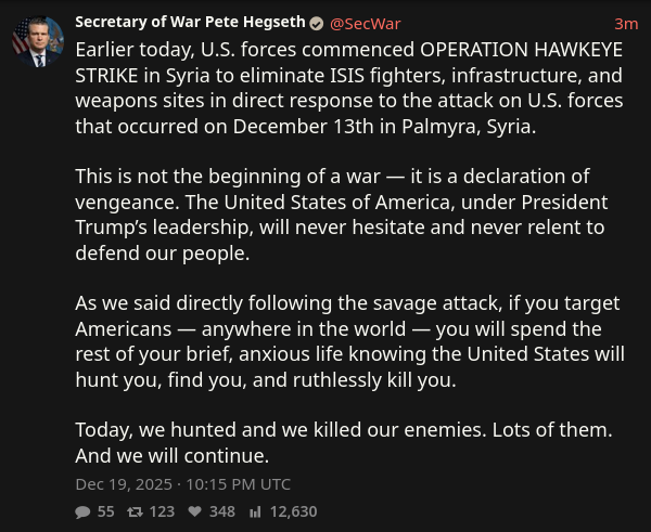 arrow-up1108arrow-down1imagePete Hegseth says that the US conducted an attack in Syria earlier todayhexbear.netdead [he/him]@hexbear.net to news@hexbear.netEnglish · edit-211 days agomessage-square40linkfedilinkfile-text
