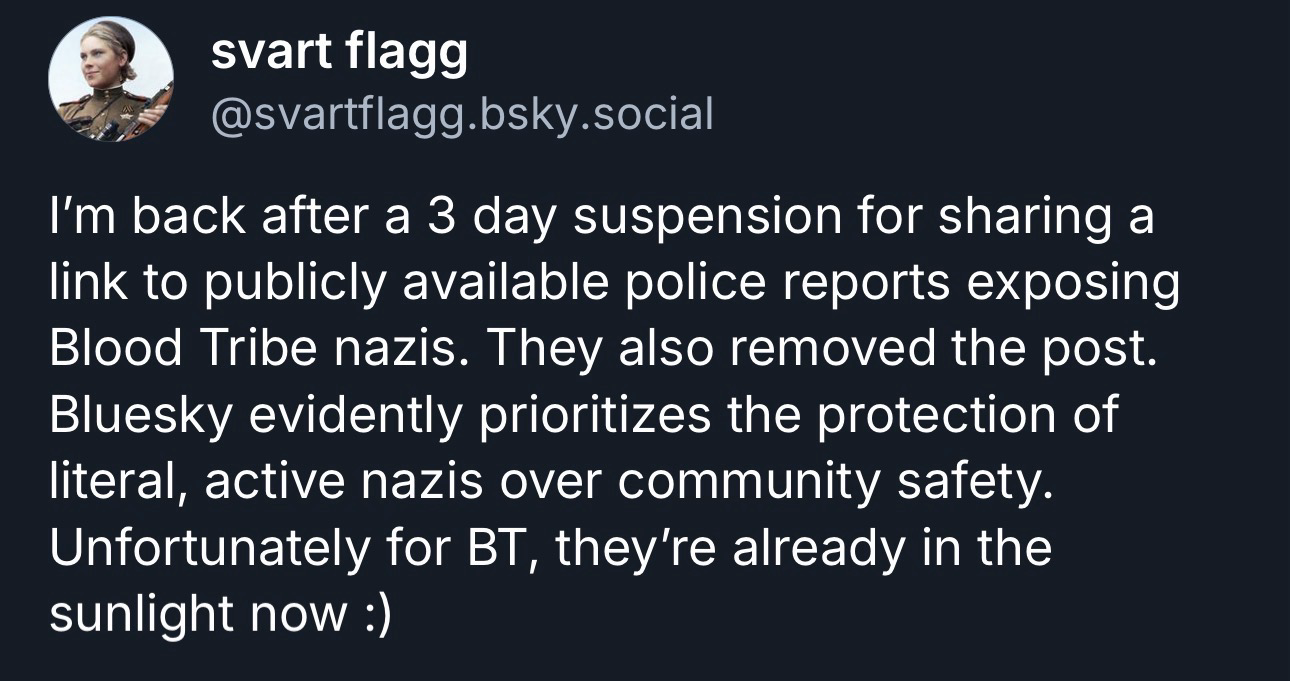 Bluesky suspending antifascist researchers for sharing publicly available information about literal nazis.