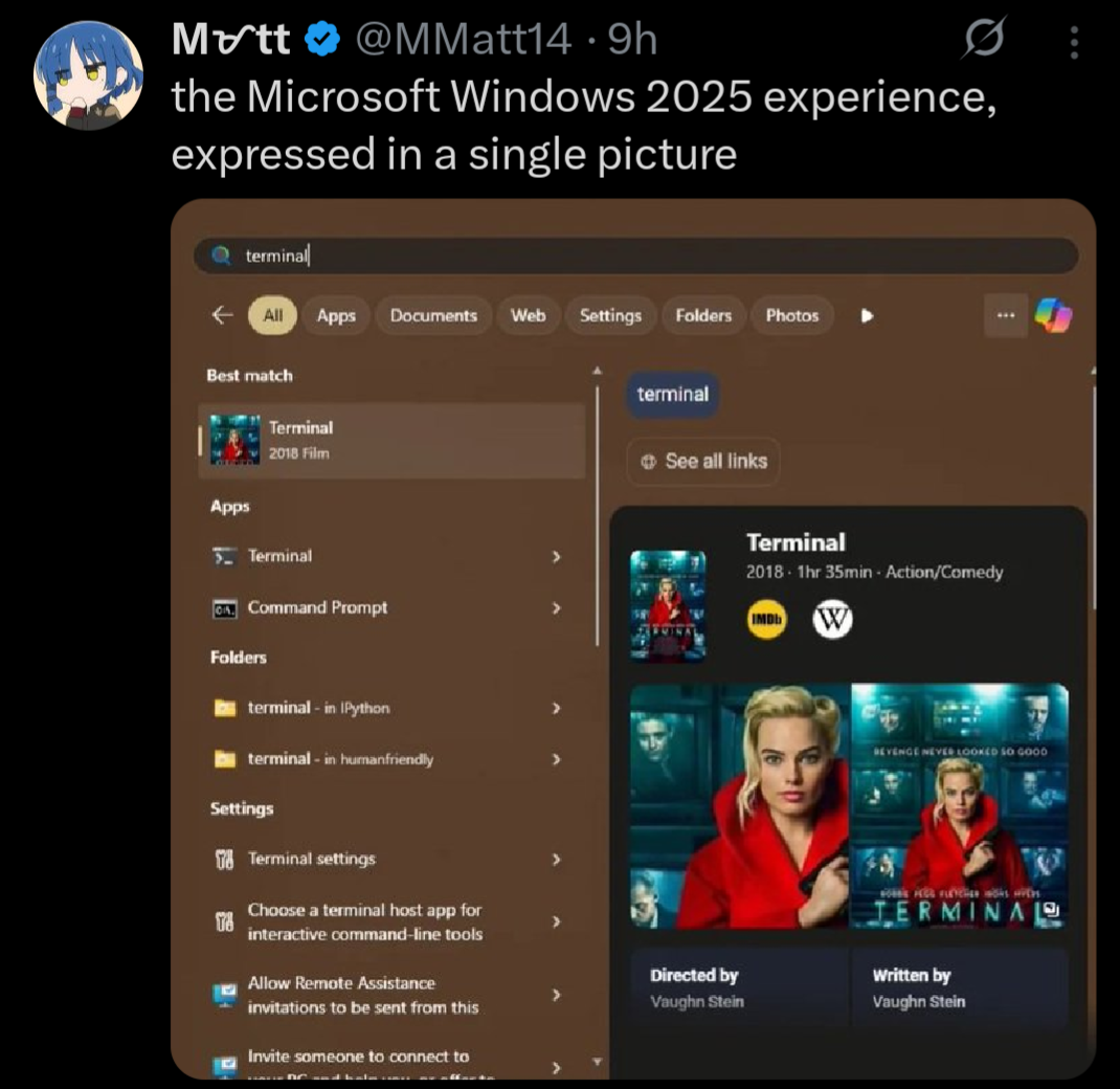 Indeed. Also, tried this when I saw it and was surprised that, not only did the Terminal app show up first, but I saw no ads in the start menu at all. Turns out the settings I set on my Windows 11 partition back in 2022 are still there, and I just don’t see stuff like this.