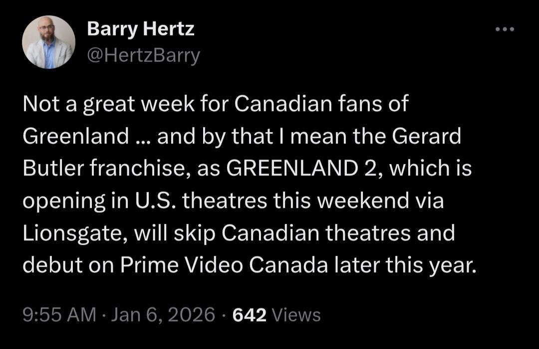 Assuming there really is a movie franchise named GREENLAND, why would they show it in cinemas in the US but not in Canada?