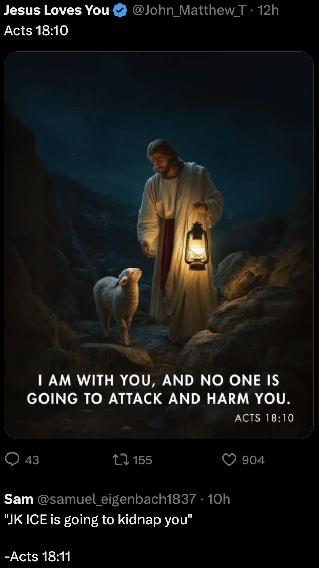 kali_fornication@lemmy.world to Microblog Memes@lemmy.worldEnglish · 5 days agoOnly Satan's children will scroll past this post without commenting "Amen"lemmy.worldimagemessage-square30linkfedilinkarrow-up1311arrow-down119