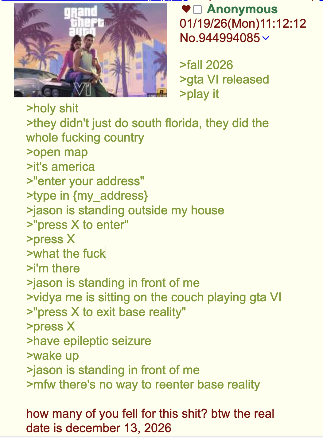arrow-up1239arrow-down1imageAnon plays GTA VIlemmy.worldkali_fornication@lemmy.world to Greentext@sh.itjust.works · 21 days agomessage-square12linkfedilink