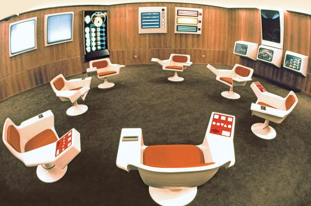 The futuristic operating room was designed by a team led by interface designer Gui Bonsiepe. It was equipped with seven swivel chairs (considered the best for creativity) with buttons, which were designed to control several large screens that could project data, and other panels with status information, although these had limited functionality as they could only display prepared pre -Graphs. This consisted of slides.