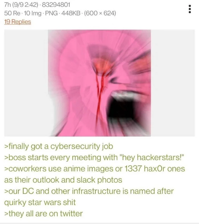 arrow-up1631arrow-down1imageAnon works in cybersecuritysh.itjust.works🍹Early to RISA 🧉@sh.itjust.worksM to Greentext@sh.itjust.works · 24 days agomessage-square96linkfedilink