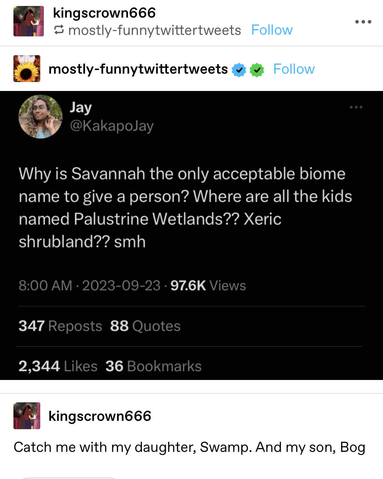 I wouldn’t fuck with anyone named Tundra or Mangrove. Those mfs might be Power Rangers in disguise