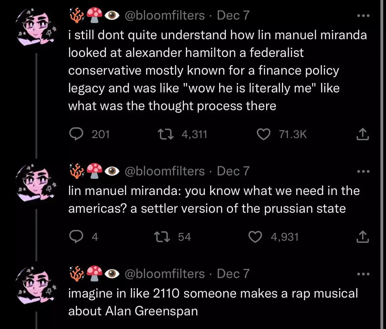 minus-squareRedbolshevik2 [he/him]@hexbear.netlinkfedilinkEnglisharrow-up1·3 years agoAlexander Hamilton was a parasite. Lin Manuel Miranda is a parasite. His dad was, IIRC, key to the privatization of Puerto Rico’s power. Mystery solved.