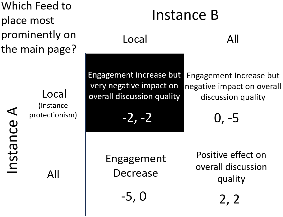 The second one isn’t prioners dilemma but battle of the sexes (yeah really dump name). I removed the All-Feed option, because for smaller instances it has really no merit to promote it (why should you promote a feed, in which your instances is effectively never present and therefore just drains away your user engagement to other instances?).