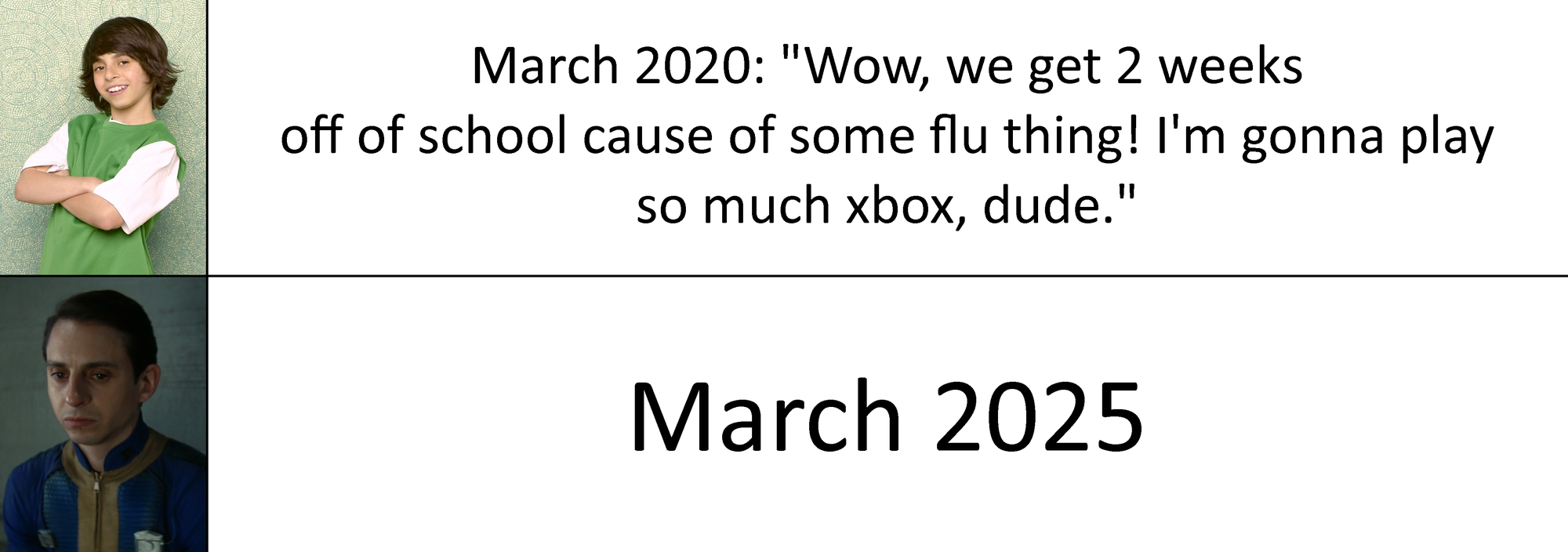 12·1 month agoNot just March 2025, just everything in those 5 years. The second version is an alt version because a lot of people transitioned in that time, including Myself. The joke is that Moises Arias played Rico on Hannah Montana, a children’s show on the Disney Channel, as well as Norman McClean on Fallout, who is constantly going through emotional termoil